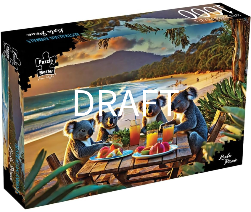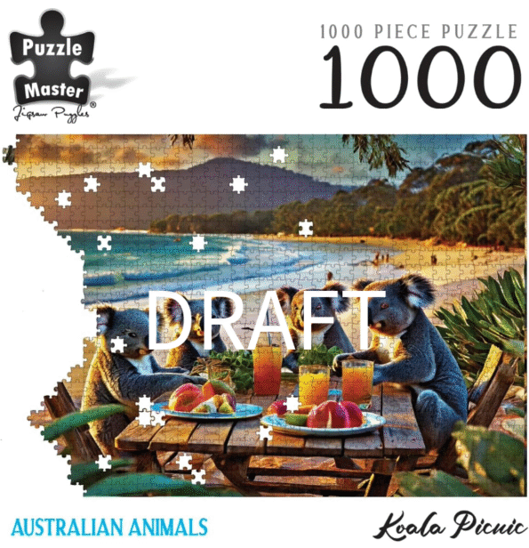 Embark on a delightful journey with Puzzle Masters’ exquisite new collection: Surreal Australia. This 1000-piece puzzle invites you into a playful adventure, where each piece unveils a scene brimming with charm and creativity. The puzzle captures a group of koalas gathered around a picnic table at the beach, enjoying a sunset picnic. These adorable marsupials are playfully seated, their fuzzy ears and inquisitive eyes adding a touch of whimsy to the scene. Each koala brings its unique personality to the gathering, creating a lively and endearing display of Australia’s beloved wildlife. In the background, the sun sets over the ocean, casting a warm glow across the beach. The golden hues reflect off the waves, creating a tranquil yet captivating setting. It’s a scene that beautifully blends the playful antics of the koalas with the serene backdrop of a coastal sunset. As you piece together this puzzle, you’ll find yourself immersed in a world where the ordinary becomes extraordinary. Whether you’re an experienced puzzler or just starting out, Surreal Australia offers a satisfying challenge that stimulates your mind and sparks your imagination. Let Puzzle Masters’ latest creation transport you to a place where beachside picnics and sunset views bring a touch of magic to every moment. Get ready to discover the joy within each piece.